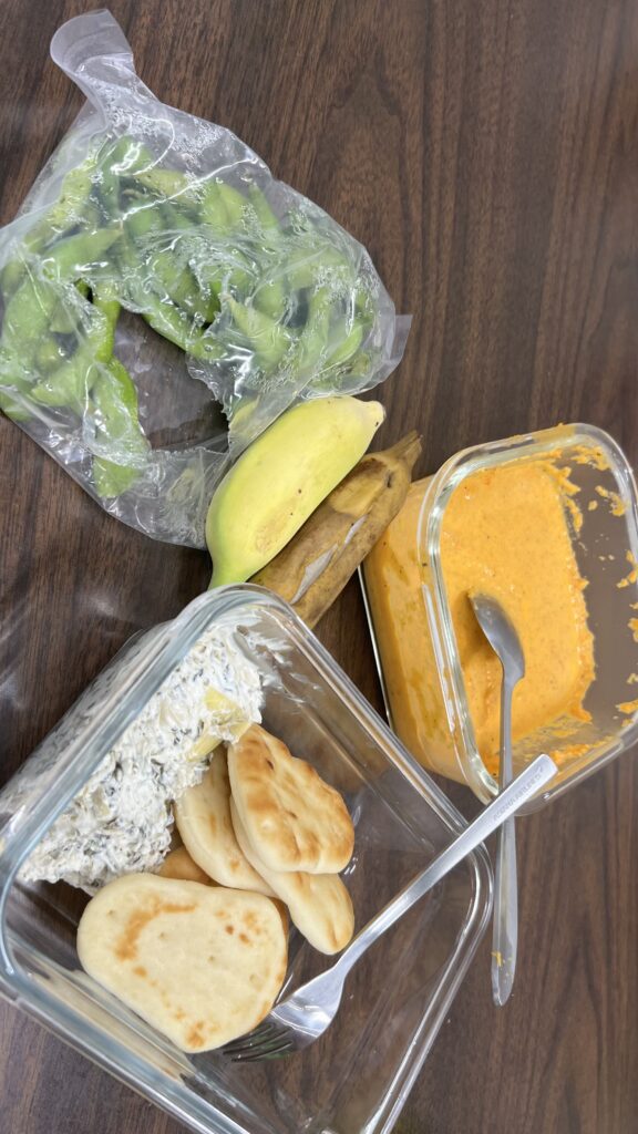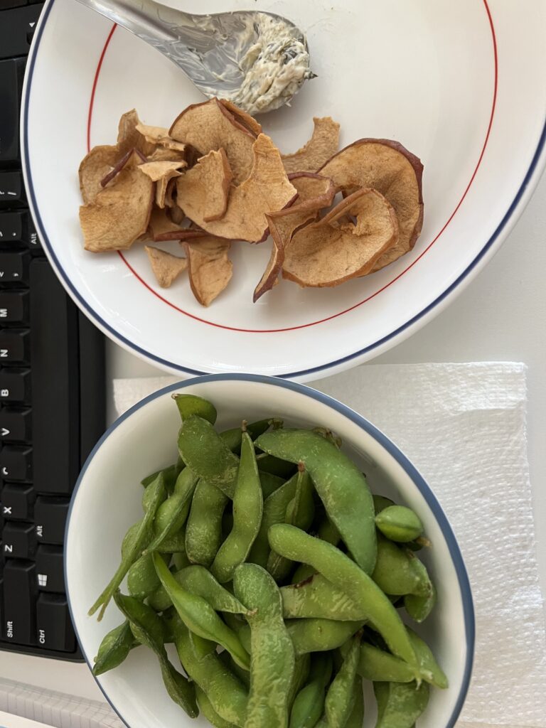 I also had some pita bread with artichoke, a handful of dehydrated apple slices and a bag of edamame microwaved for 2.5 minutes.