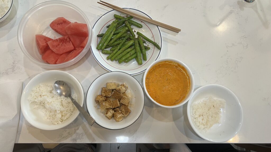 For dinner, I was going to do stir-fried mushrooms, stir-fried asparagus and sweet & sour air-fried tofu cubes; however, I ran out of time, so I only did stir-fried asparagus. Since tofu was being air-fried and ready to eat, we also included it in our dinner by having it with soy sauce. It was not bad. Quick and nutritious meal!